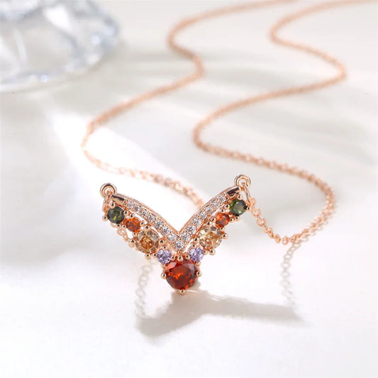 Letter V Pendant Multicolor Zircon Engagement Necklaces For Women Vintage Rose Gold Color Chain Wedding Jewelry Versatile Gifts